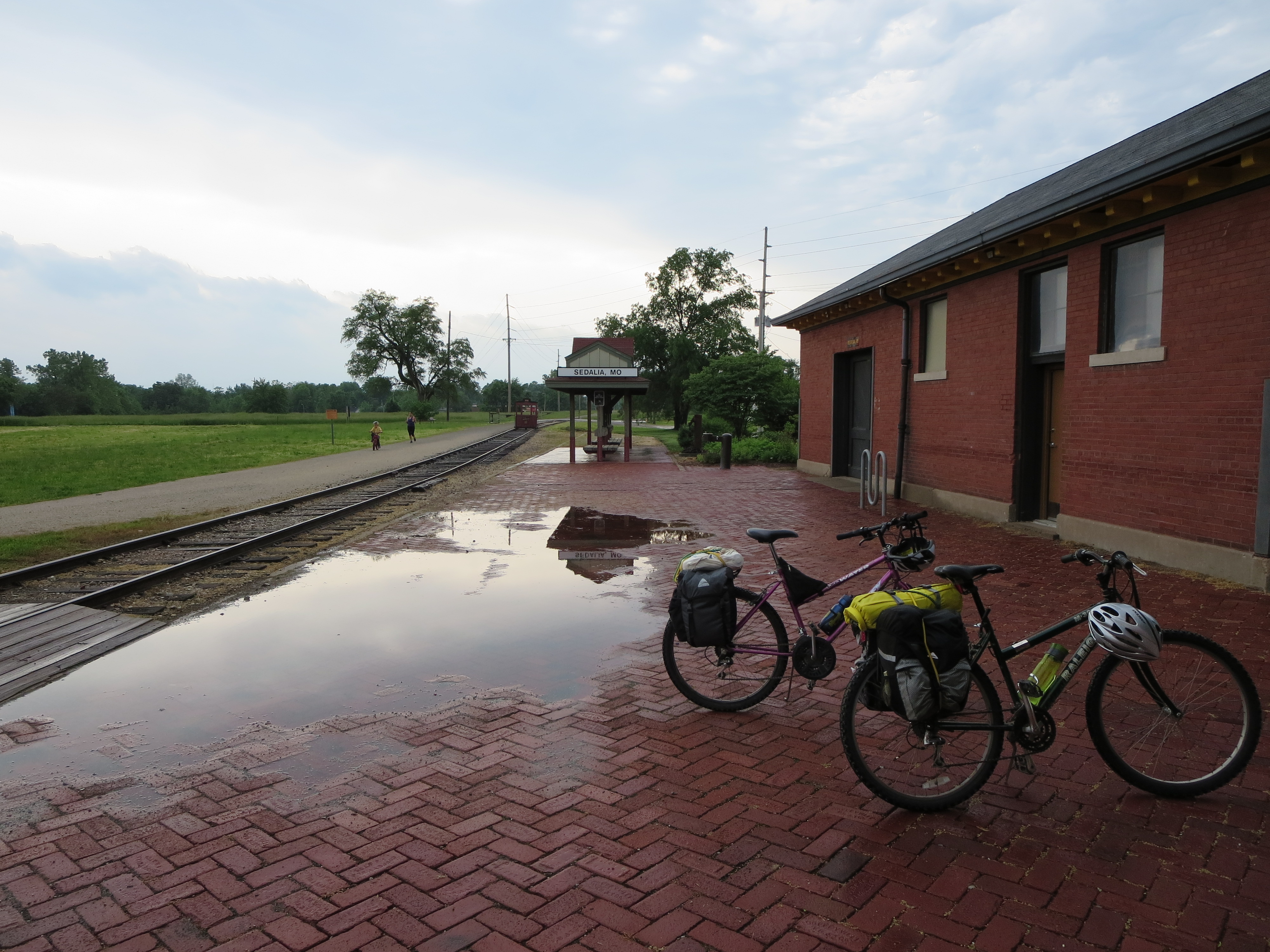 I biked the trail with my friend Ginny. We didn’t have enough time to do the whole trail; we started in Hermann, MO (in the rain) and ended in Sedalia (in the rain). Here are some of the highlights: