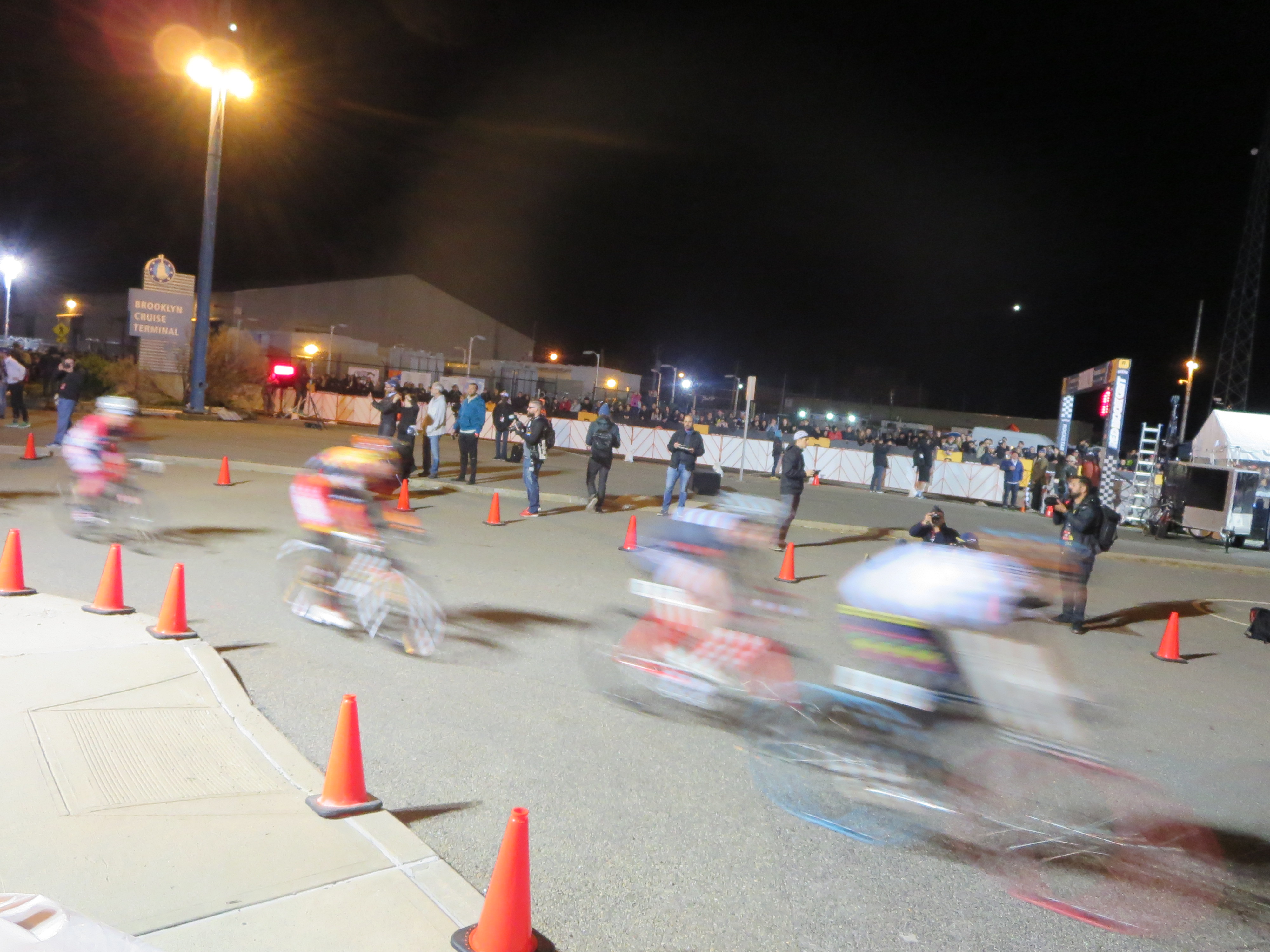 On a Saturday night in April I biked over to the Brooklyn Cruise Terminal at 8pm. I wasn’t gonna miss this: I had been hearing about it for weeks: Red Hook Crit is one of the most reputed, and dangerous, bike races in New York. Anyone can enter the qualifying rounds, so you end up with a combination of pro-racers and newbies. This is part of what makes it dangerous–you have a combination of racers who know what they’re doing and racers who don’t.
