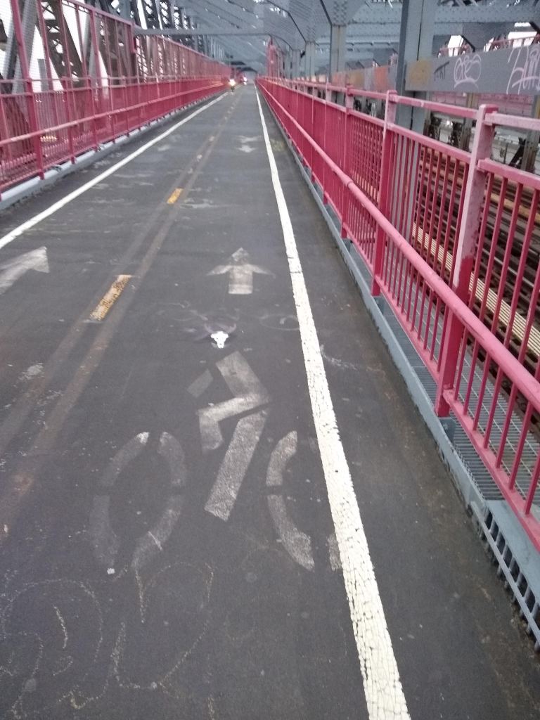 The Williamsburg Bridge has completely separate paths for cyclists and pedestrians to cross. Pedestrians enter the bridge on the south side. Cyclists climb the ramp on the north side which is where I hustled my way up. I heard a train coming from behind and I tried to stay ahead of it. It is fun to race trains and I was having a GREAT TIME. I slowed down for the quick-left-followed-by-quick-right turn. And around the corner I saw a mother (I assume) and two young children in the bike lane. I would like to point out that they weren’t even walking, but just hanging out in the bike lane.