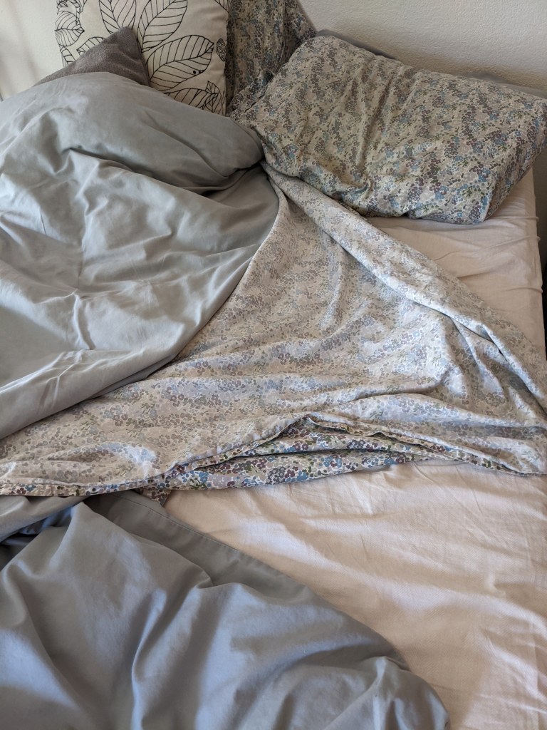 Well, in very exciting news I’ve been sleeping on my side again. It is comfortable, not painful! and oh so sweet. But strangely I’ve been sleeping like crap. I wake up all the time and every time I try a new sleeping position but it doesn’t help me fall asleep any faster. I squirm until the sun comes up.