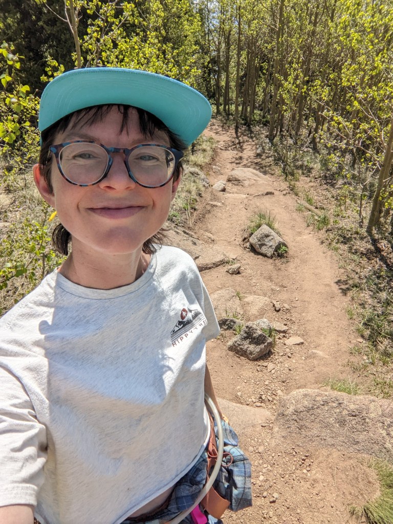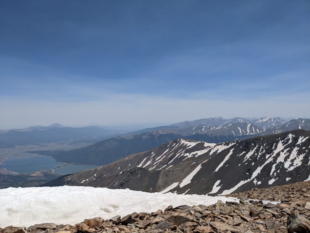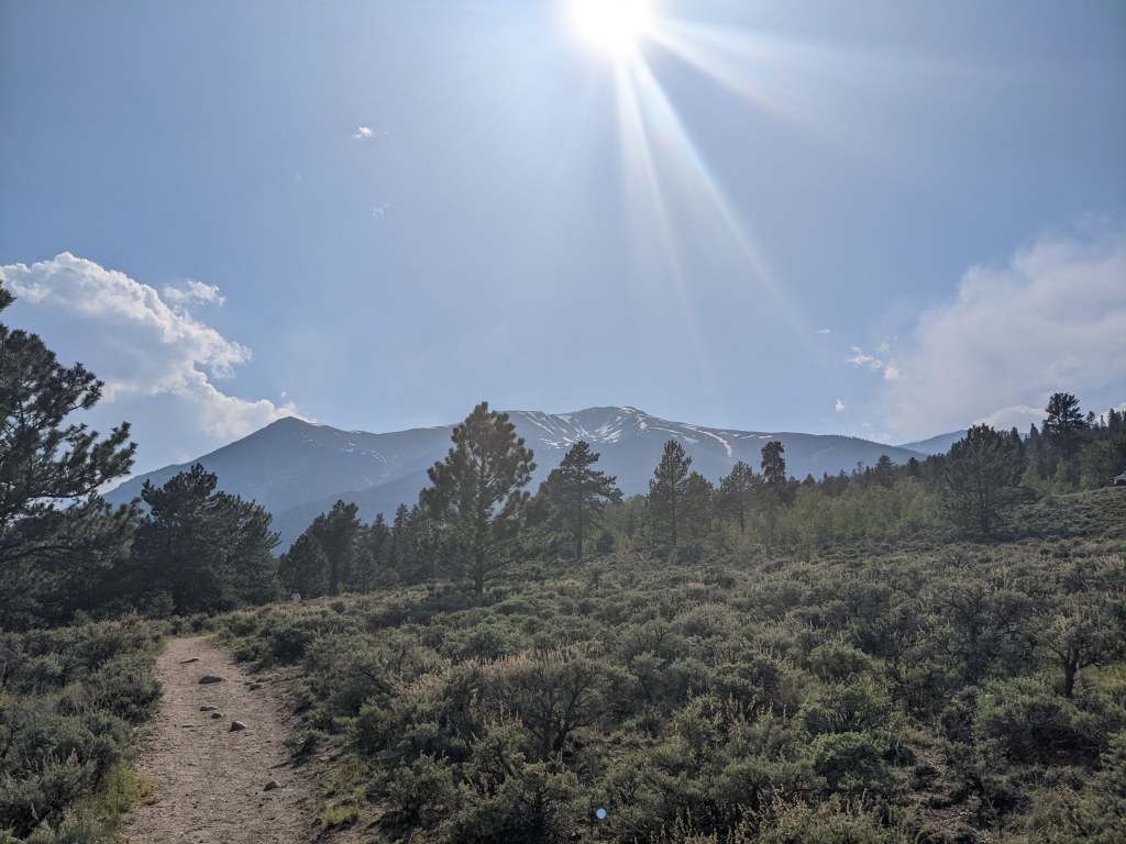 So at 9am (way too late), I begin. The trail is lovely. You can see the twin lakes. I have to follow the Colorado Trail for a few miles to get to the Mt. Elbert south summit trail. It goes along a few campsites. I pass people coming the other way. There’s a huge grove of Aspens that will be beautiful in the fall. But also it’s beautiful now there are so many and their white trunks are skinny little columns with bursts of vibrant green leaves at the top. I cross a loud and rushing river on a footbridge. I hike up a few switchbacks. I’m feeling good and hiking fast. A couple with a golden retriever pulls him aside when I pass and I say that he is a good dog and they smile. These are the first people I’ve passed going the same direction as me.