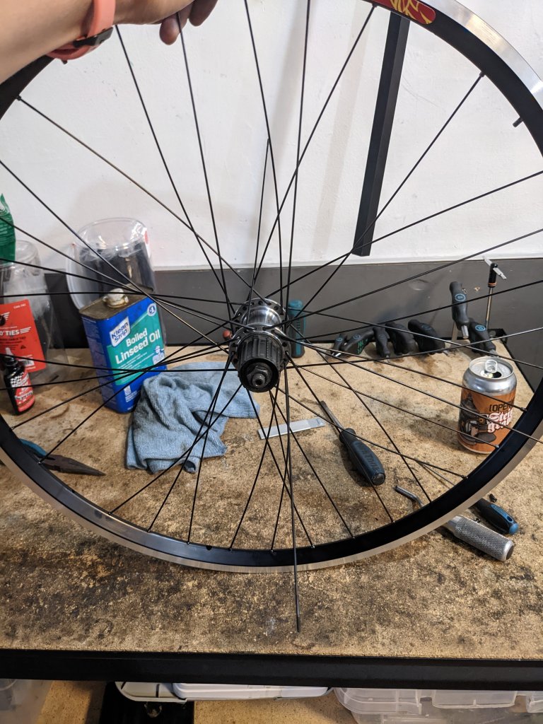 You know, I didn’t hate it. It required a kind of tunnel vision. To step back and look at the whole wheel and try to understand made me feel dizzy. All I could do was look at the one freed spoke, right it, and then slowly loosen more spokes until another one was free again. I moved around the wheel like a wave, repeating this process, loosening little by little, correcting little by little. I could not see the big picture only the small choices that I made as I went: this spoke goes under that one, that is all I know for sure. One spoke, another spoke another spoke.